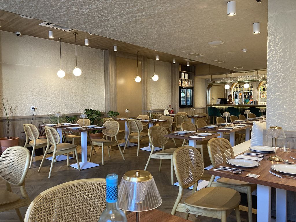 O restaurante é moderno, tem uma ampla sala e esplanada.