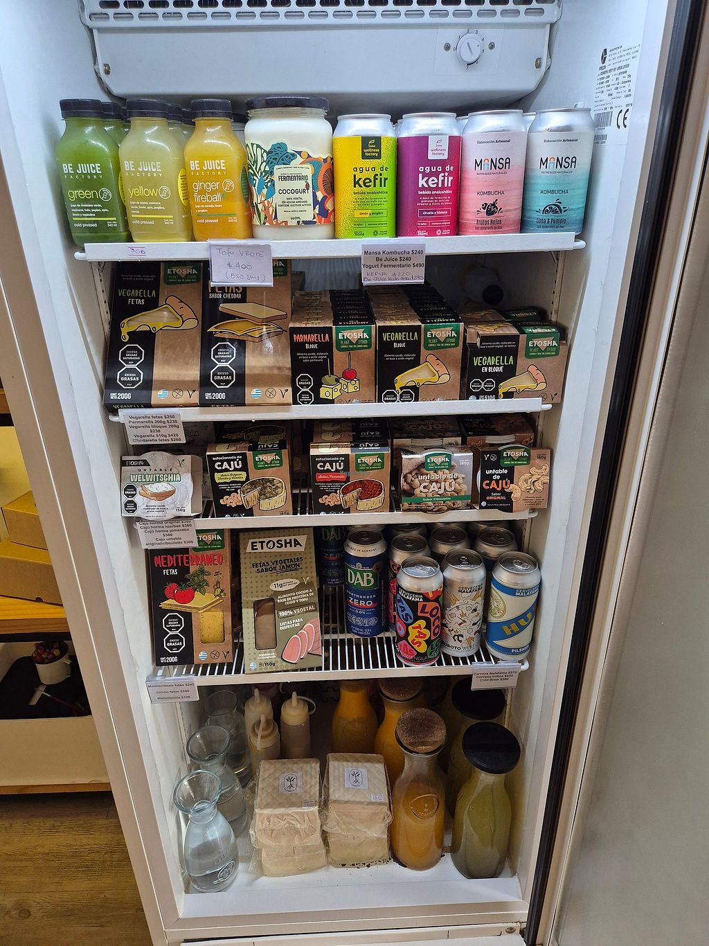 Todo el menú es vegano y también venden productos veganos como cereales, bebidas vegetales, skin care y carteras.