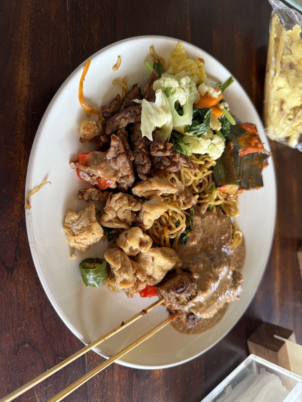 Big portions, cheap, tasty food with lots of vegan options. However it is quite oily. When I first moved to Bali I used to be sick every night after eating here (and so did many of my friends). However now I have been in Bali for 2 years and my stomach has got more used to the food so I can eat here occasionally and not get sick anymore. However if you have just arrived in Bali I would be careful