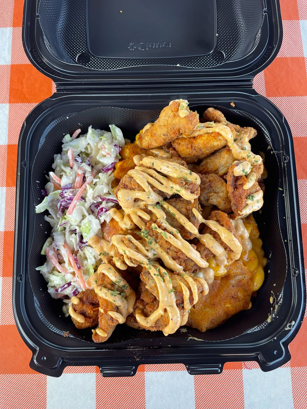 i got the mac mama plate at the north park vegan pop up and it was to die for 😍 best vegan mac and cheese hands down. the oyster mushroom fried chicken was amazing and the sauce and slaw perfectly balanced out the flavors