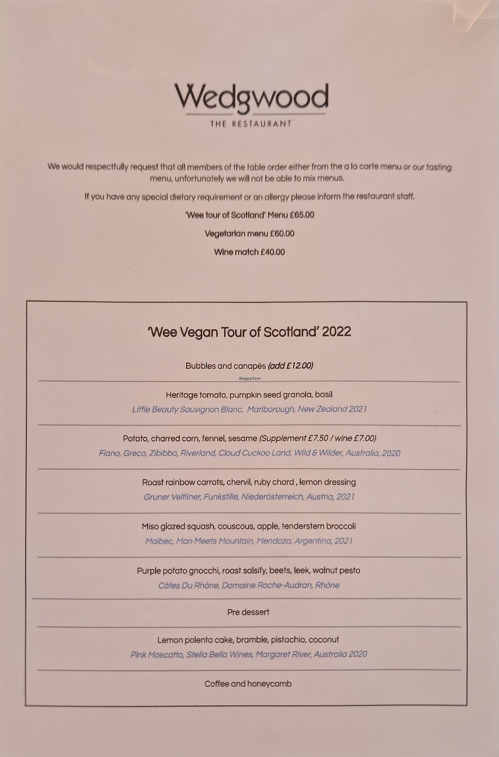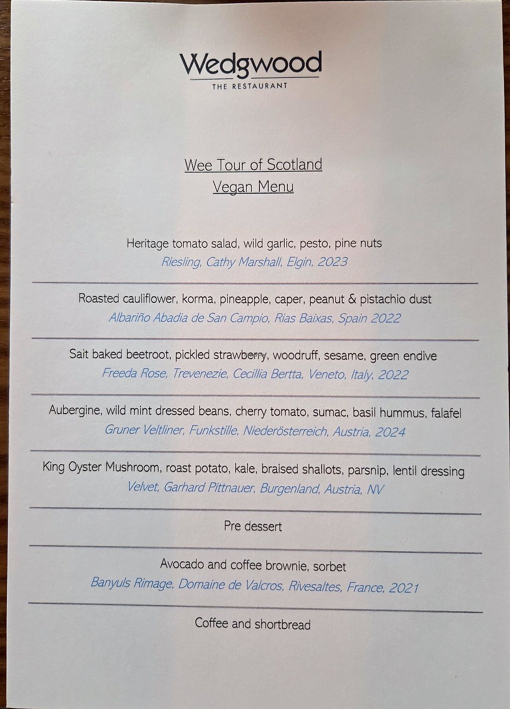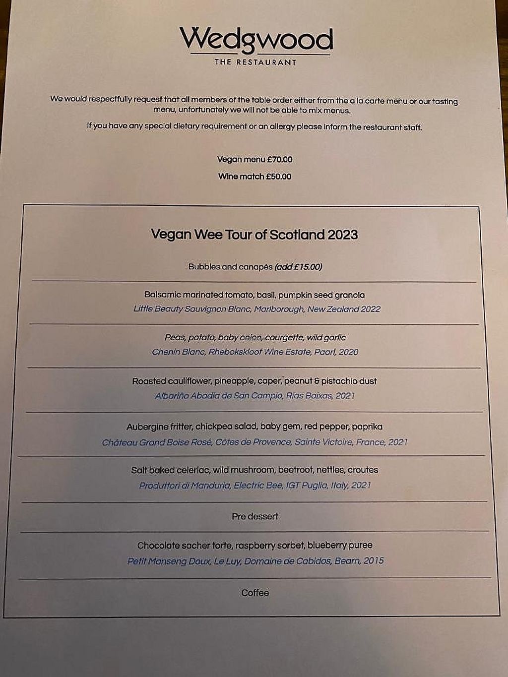 My partner and I have been here on my birthday for three years out of the last 4. We always go for the vegan tasting menu with wine pairings which is spectacular. The staff are friendly and knowledgeable, the food is beautifully presented and tastes amazing, and they have a fantastic selection of vegan wines. I highly recommend Wedgwood and will absolutely return.