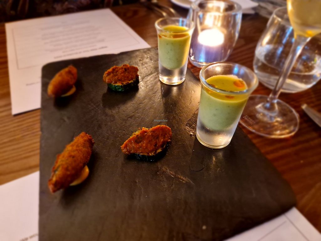 Tasting menu or a la carte options. I went a la carte - three very decent courses with also bread with tasty oil dip, and the chef made three special canapes- fresh light felafel bite, spoonful of gazpacho soup, shot of elderflower and soda- not sweet at all.