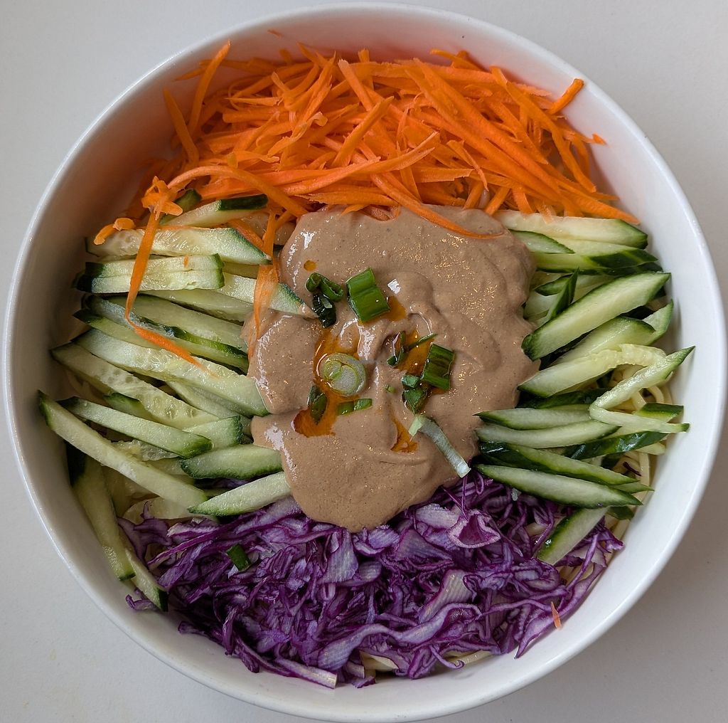 The flaky Scallion Pancake was served warm with soy sauce. I ordered the Cold Noodle (wheat noodles, cabbage, carrots, and cucumber) without egg. It was simple, but the peanut sesame dressing was delicious.