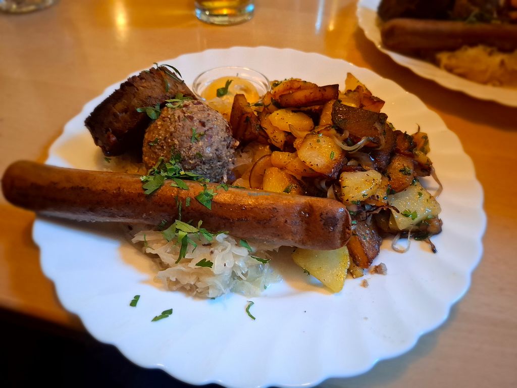 Mega gutes deftiges Wirtshaus-Essen, von Saumagen, Bratwürste, Leberknödel über Sauerkraut und Bratkartoffeln, und das alles vegan❤️