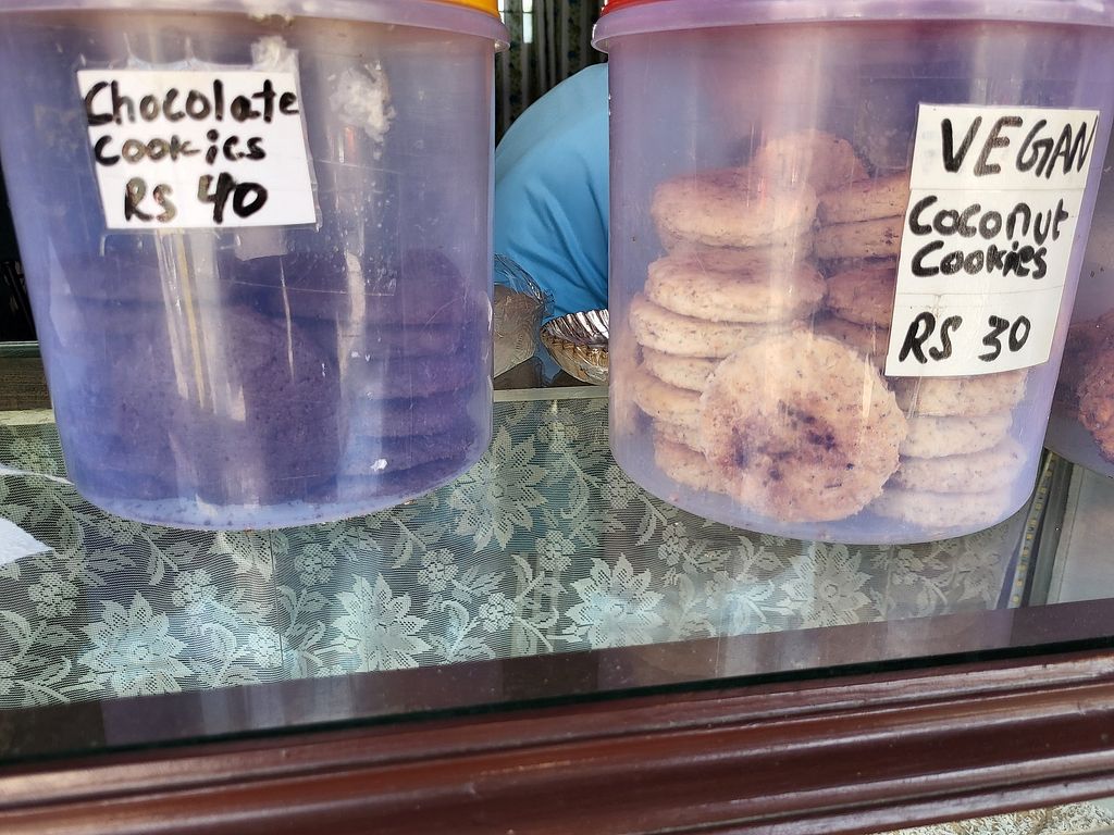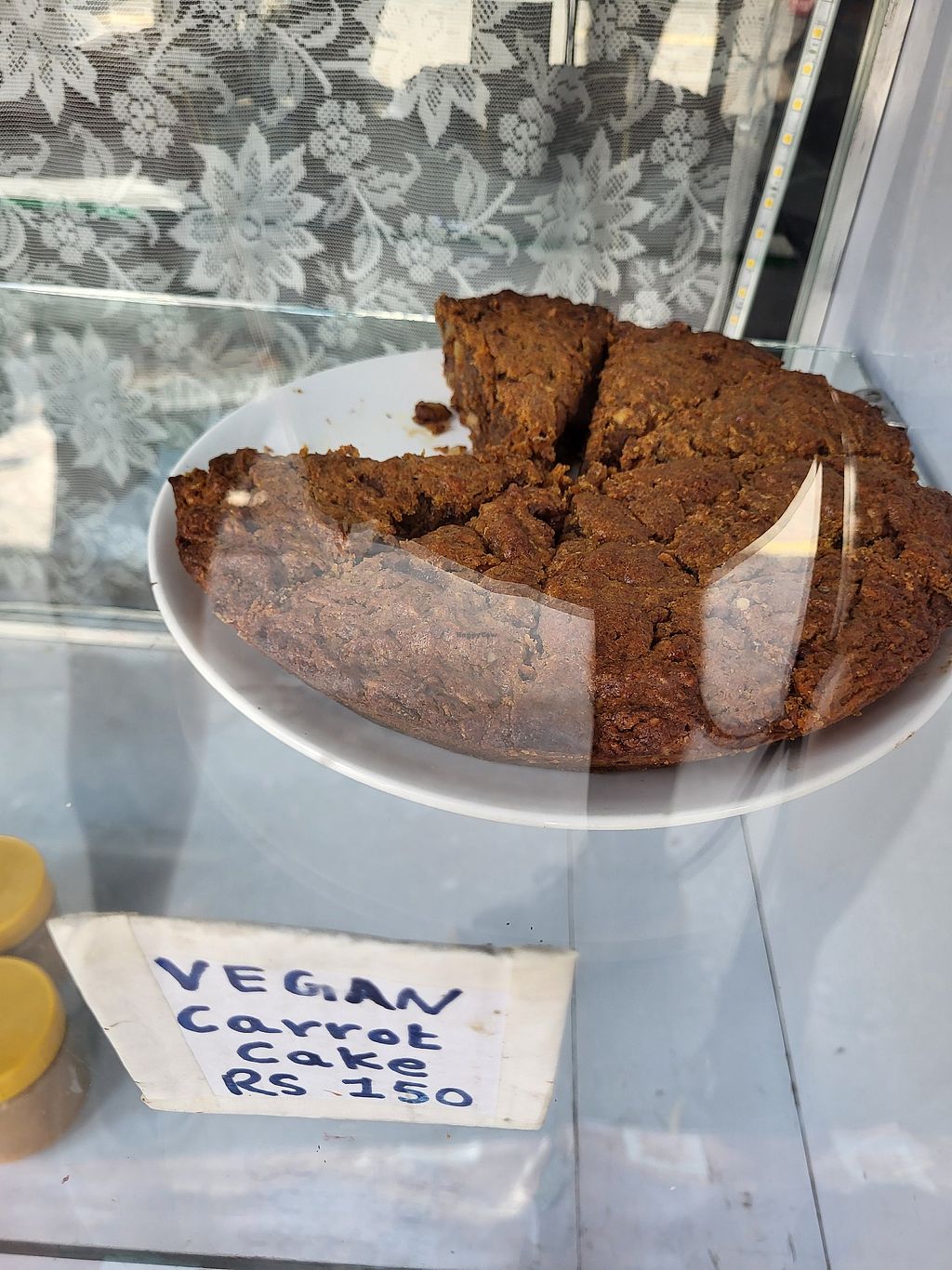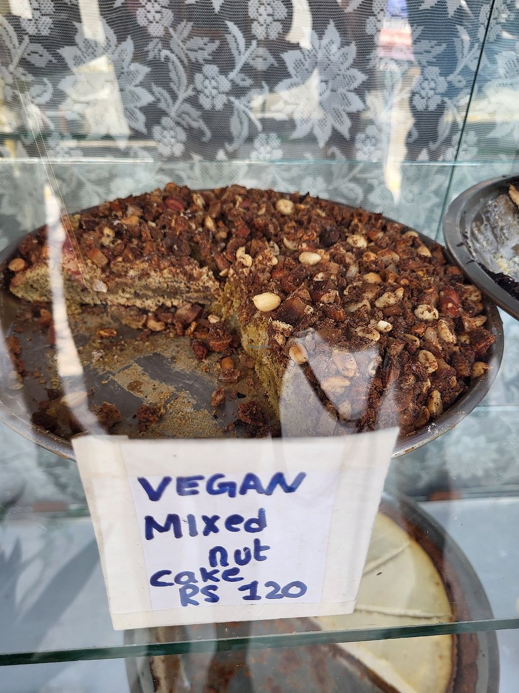 Lovely bakery with lots of vegetarian options. The only option for vegan is banana cake. It is lovely and costs only 100 rupees for one slide. I can't try other cookies and pastries because they are not vegan. However, for vegetarians, there are a range of options, including veggies puff, cookies and muffins.