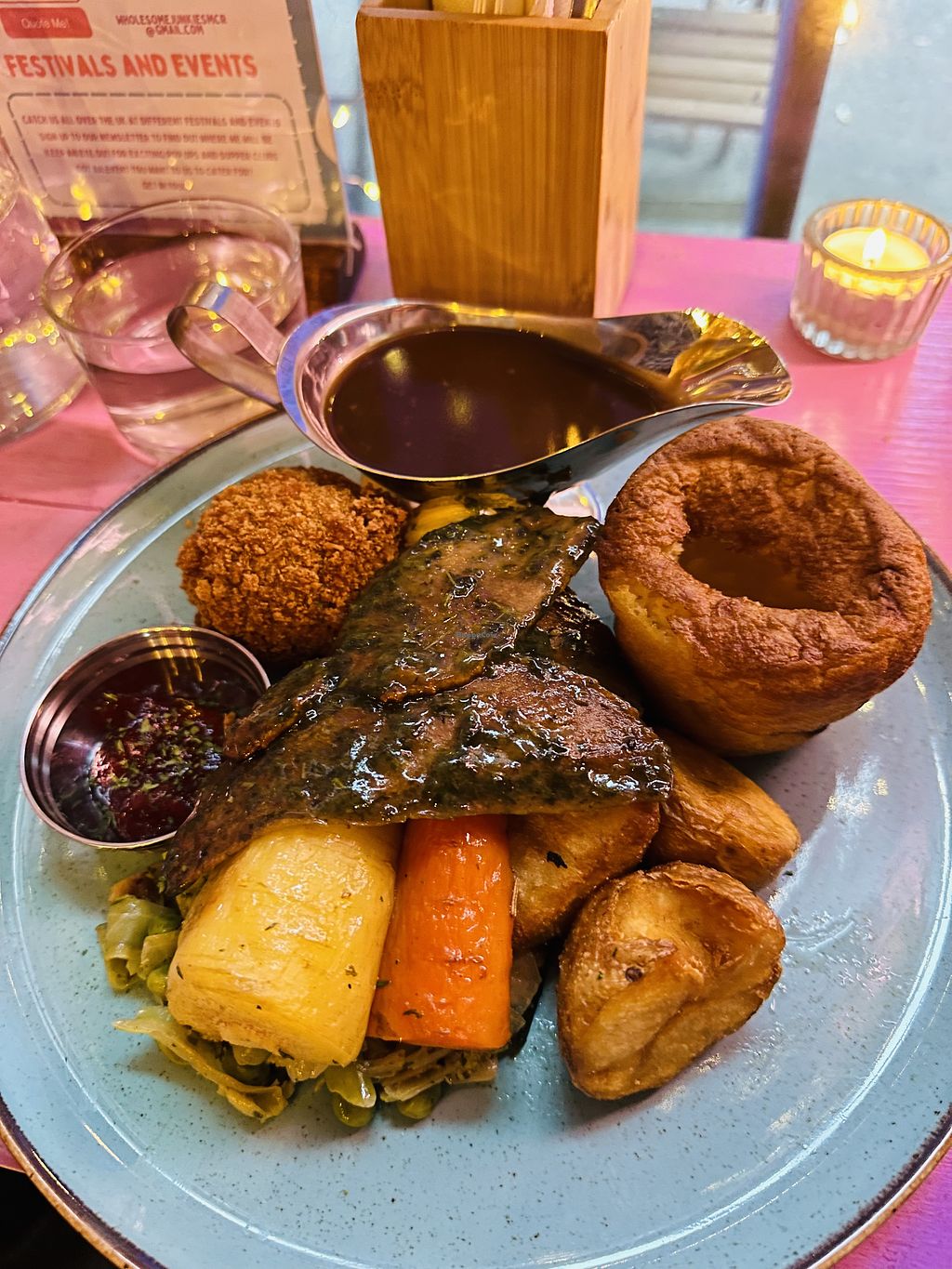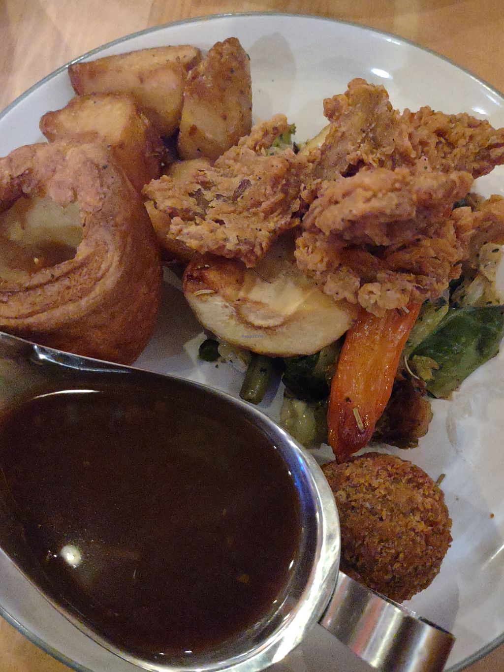 Took my non vegan friend here for a Sunday roast dinner and we both loved it. The Yorkshire pudding was immense and a great selection of veggies and gravy to go with the roast potatoes, sausages, cranberry sauce and stuffing ball.