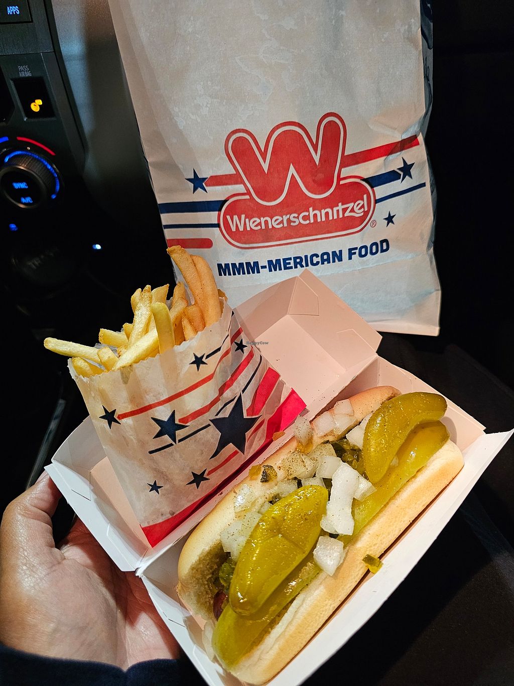 Serves meat, vegan options available. Fast food chain offering Field Roast brand vegan dogs and vegan pretzel buns. Varieties include Chicago dog, BBQ dog and backyard dog. Specify no dairy when ordering. Open Mon-Sun 10:00am-12:00am.