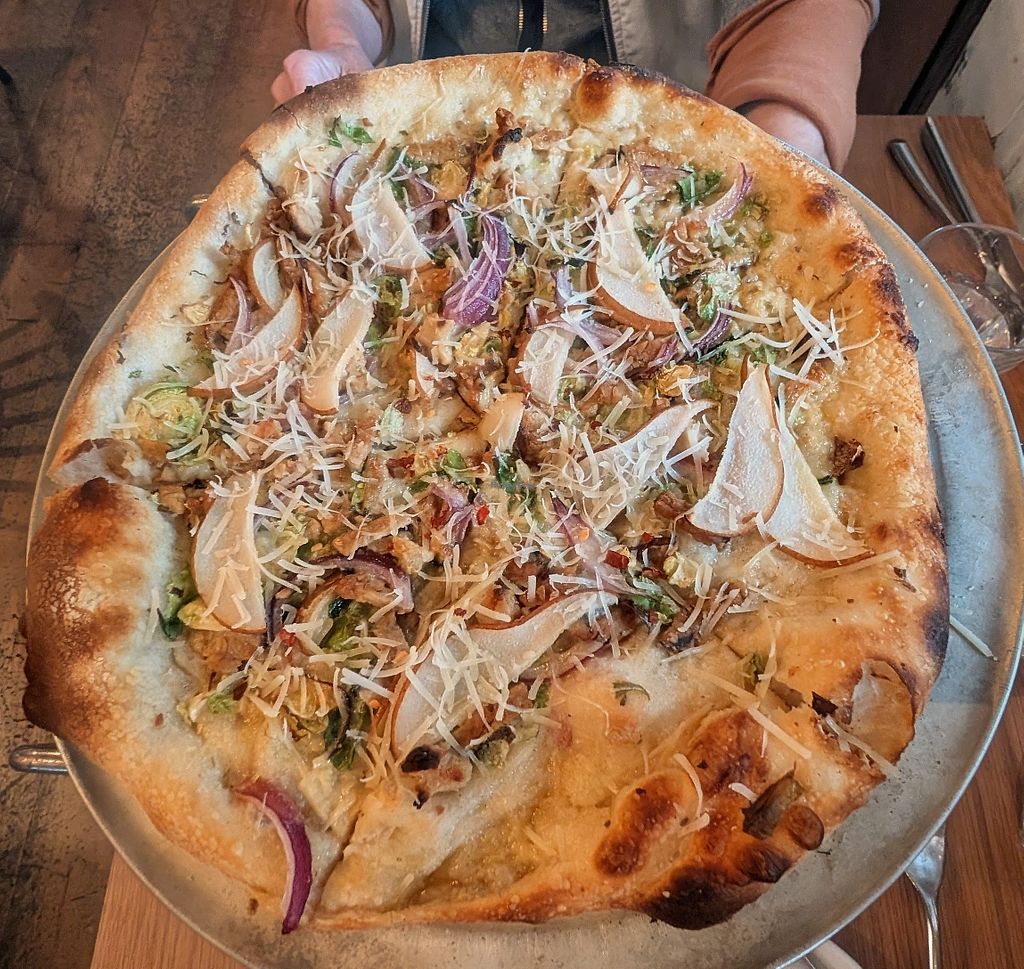 We shared a winter pizza which was so dang good. I loved the crustiness of the crust, the thin slices of pear, the tempeh bacon. So delicious.
