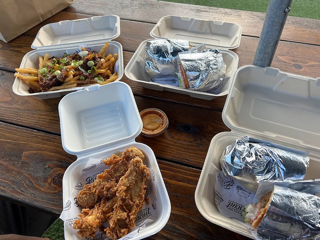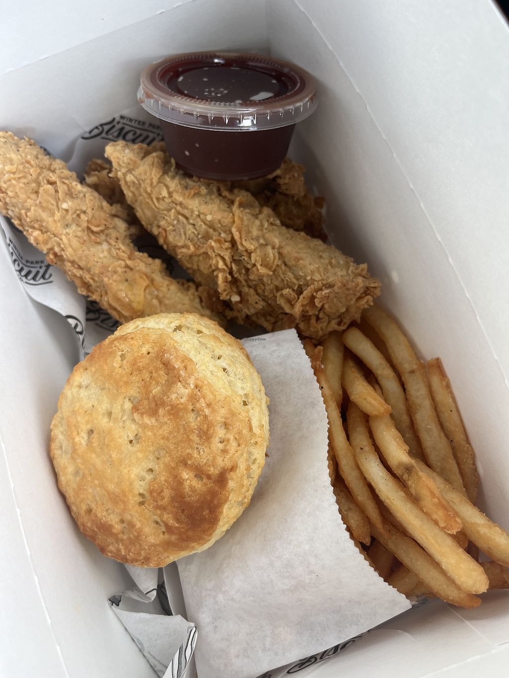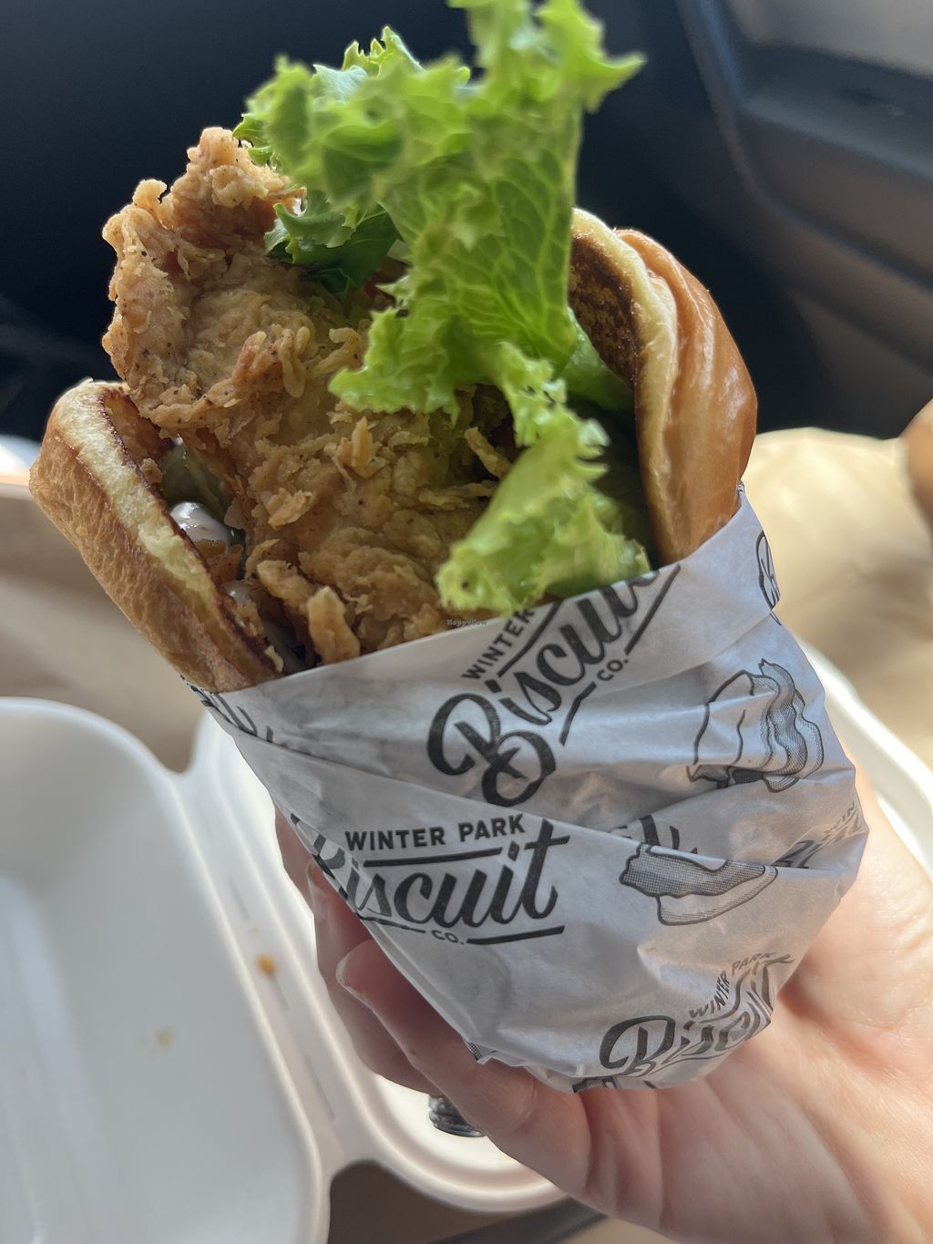 Whew...where do I begin. I've wanted to stop by this place on my previous trip to Orlando but wasn't able to. This time I made it a point to stop by winter bisquit co. They did not disappoint. Chickenless chicken was cooked perfectly. Bisquit was great also. It was worth the wait. Very crispy..the way I like my fried items. I'm a fan for real now. Anytime I visit Florida, winter park bisquit co. Is a must stop.
