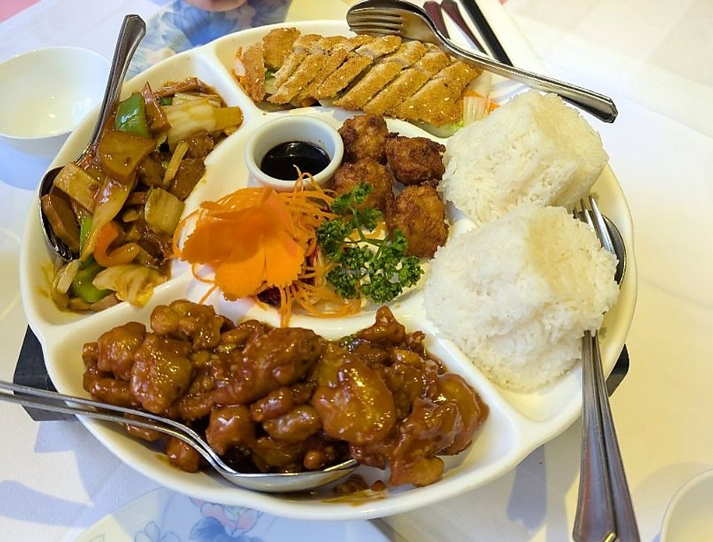 Es gabe das verboten gute "Huhn" mit Gemüse und gebratenem Reis, gebackenes "Huhn" mit gebratenen Nudeln, Wan Tan gebacken und "Hähnchen"keulen.