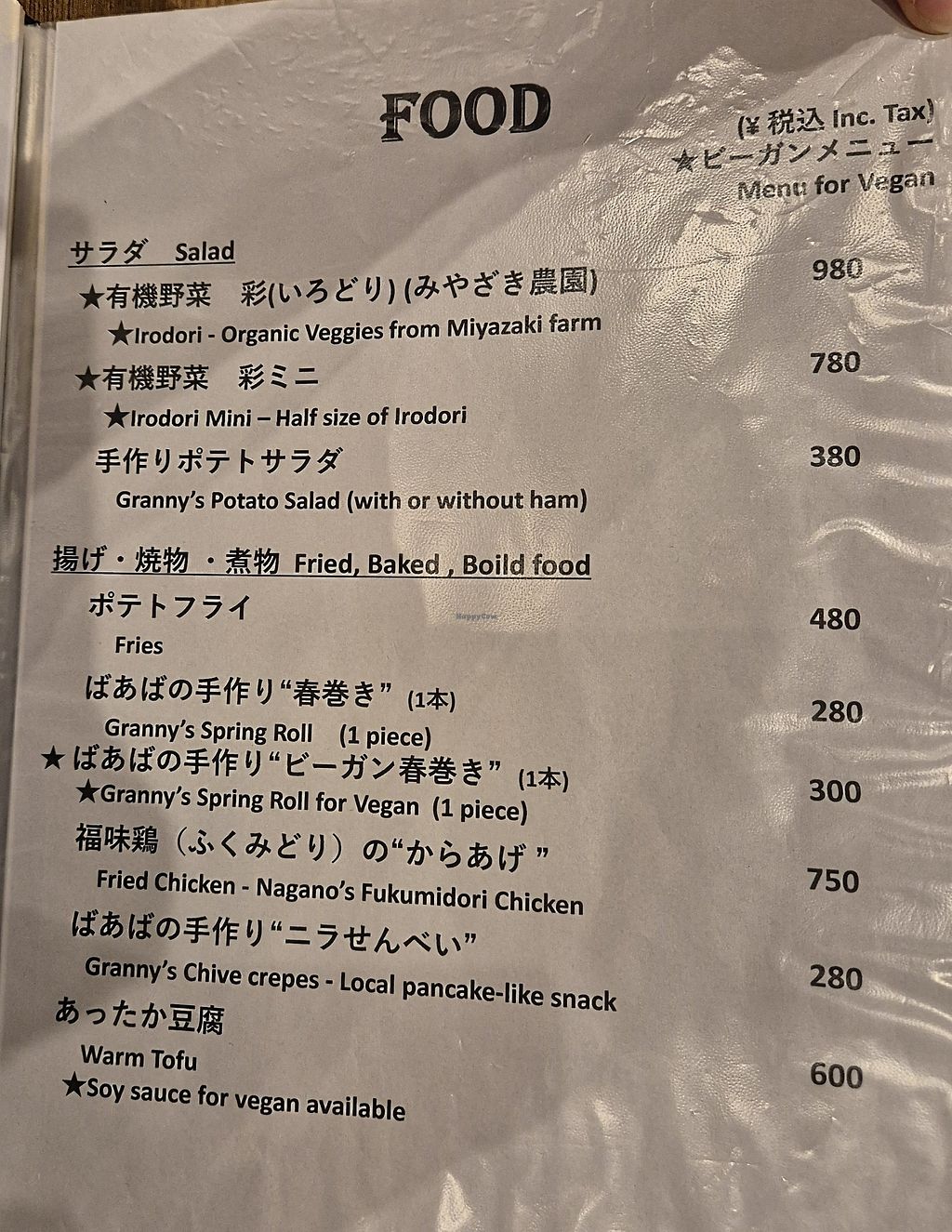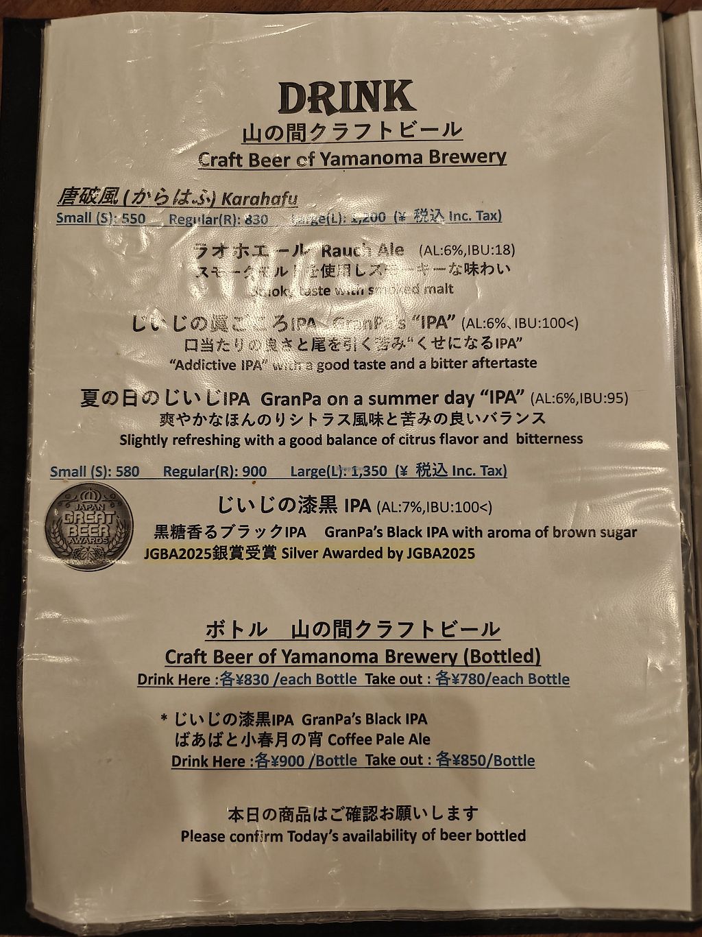 Serves meat, vegan options available. Local pub serving beer from their brewery. Has many clearly marked vegan items such as Japanese chilled tofu (hiyayakko), pickled vegetables, cabbage bowl, soy sauce boiled sprouts (kyarabuki), nozawana, salad with vegan dressing, tofu burger, and grilled onigiri. Open Mon 3:00pm-9:00pm, Thu-Sun 3:00pm-9:00pm. Closed Tue-Wed.