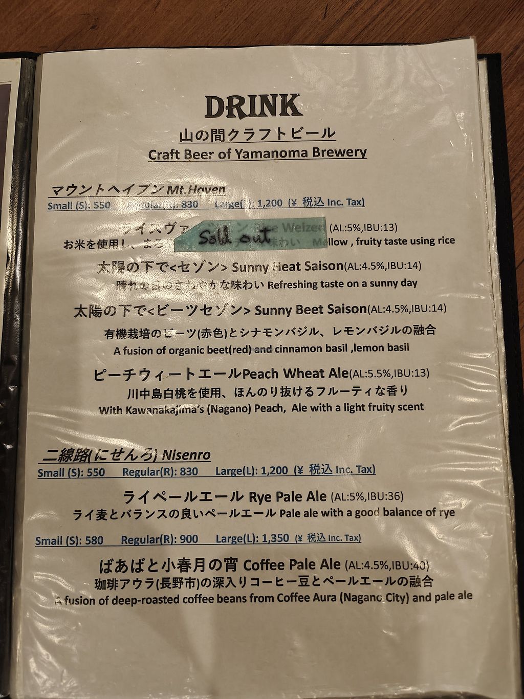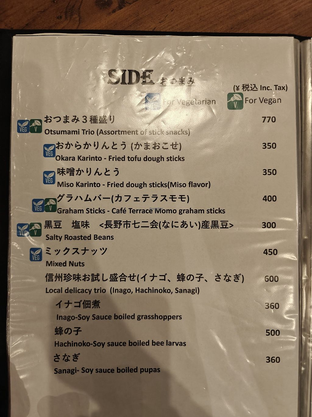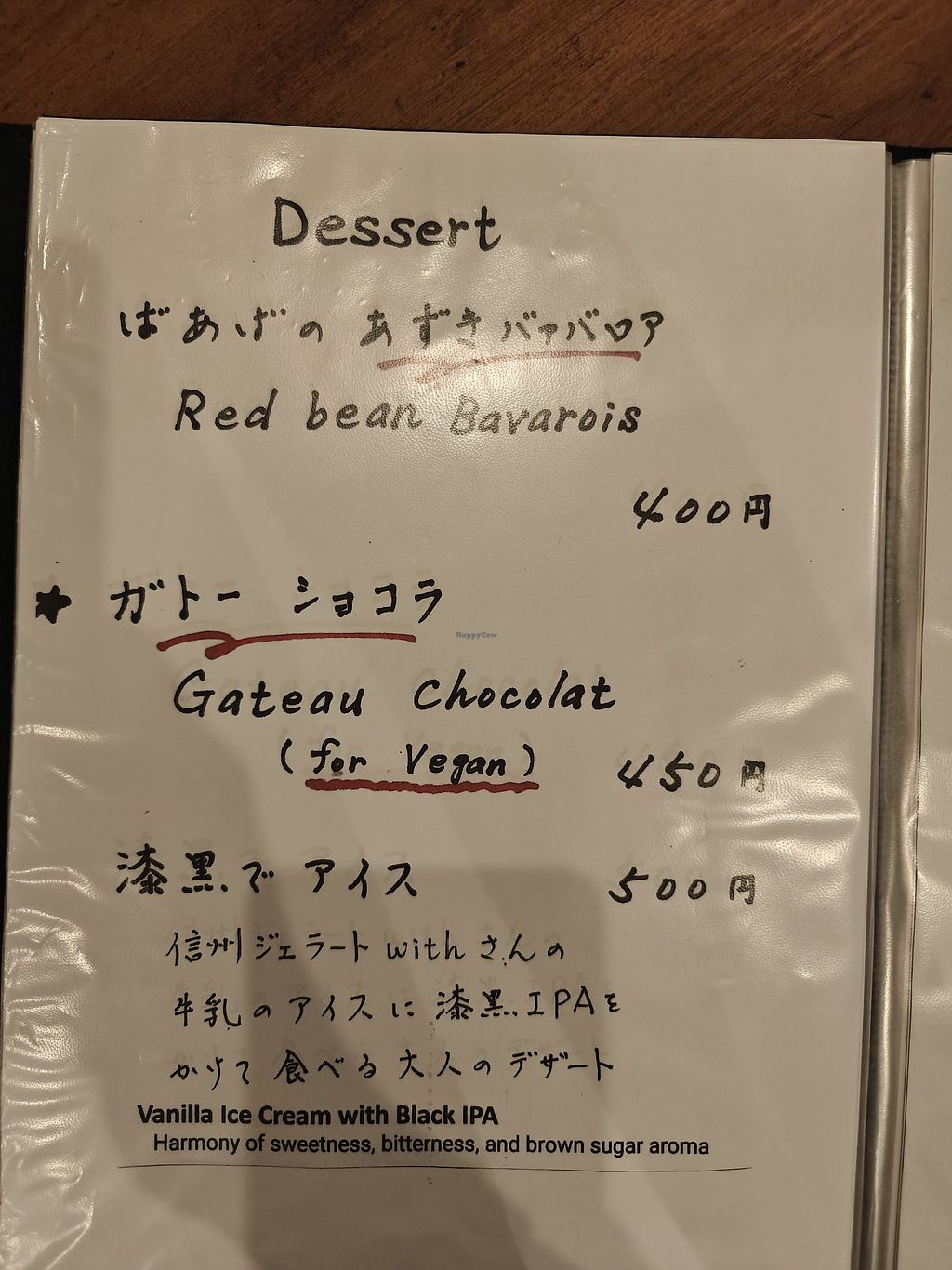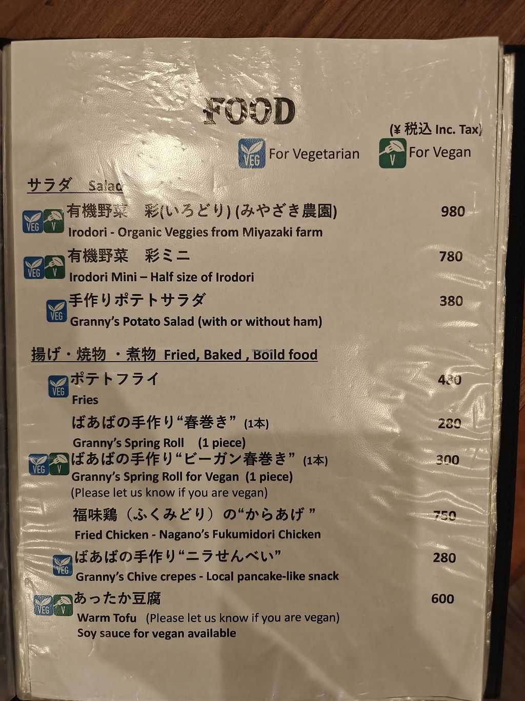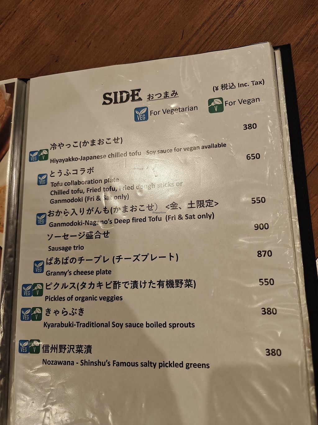 Well labeled and plentiful vegan options. Food was delicious and generous. The couple who runs this place sources all of their veggies, tofu, miso, and breads from local farmers, bakers, brewers, and tofu makers. The beer is top notch as well with unique flavors such as rice and roasted malts. If you are vegan in Nagano you owe it to this couple and to yourself to pop in and try their Grilled Onigiri at the very least. Beautiful couple and a beautiful experience.
