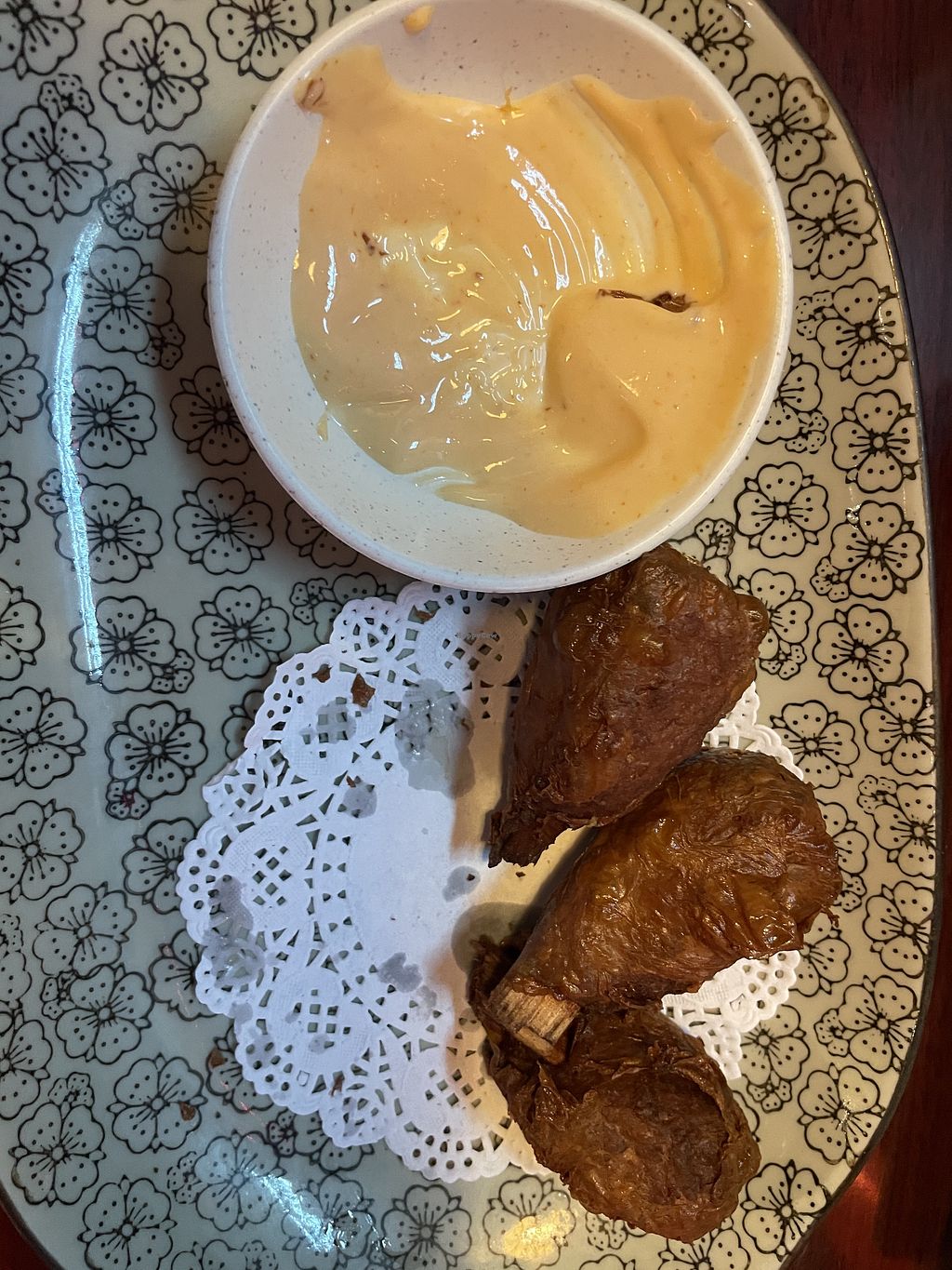 Read moreVEGAN WINGS - served on what looked and tasted like a cassava or yucca stick. These wings had a great taste and a nice consistency - not too chewy. They were served with vegan mayo, which I mixed with wasabi to create a spicy mayo. This made for a yummy topping. I would like to see them offer a vegan buffalo sauce or honey mustard as a dipping sauce for these. 10/10 would order this again.