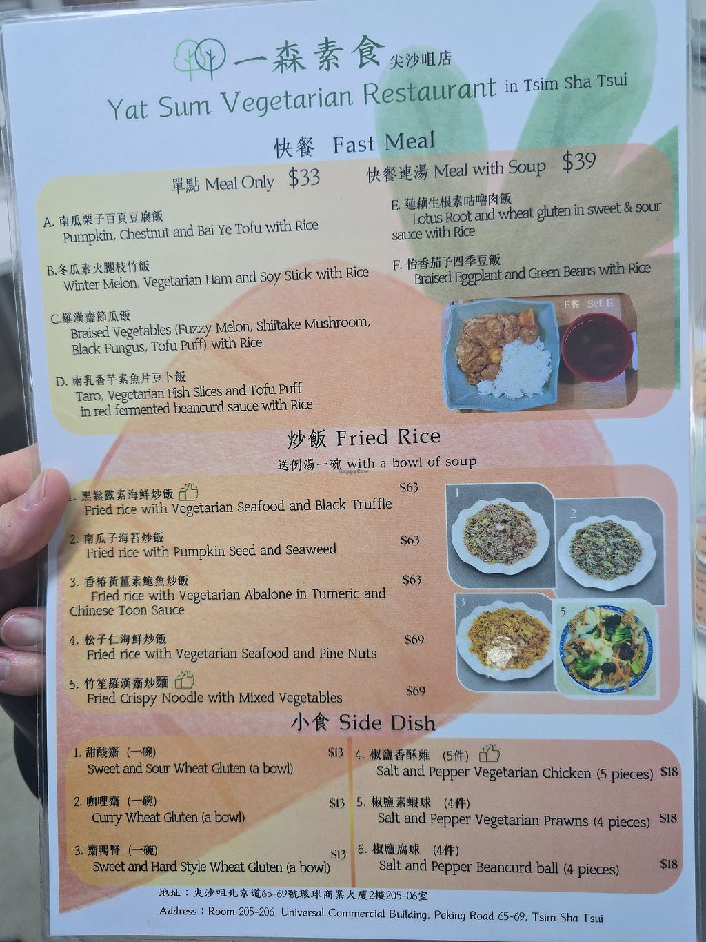 Hong Kong style vegan eatery located one min walk from Tsim Sha Tsui MTR station, exit E. Yat sum means "one forest." Offers pumpkin, chestnut and tofu with rice 南瓜栗子百頁豆腐飯, winter melon, veggie ham and soy strips with rice 冬瓜素火腿枝竹飯, shiitake mushrooms, black fungus and hairy gourds with rice 冬菇雲耳節瓜飯, taro, veggie fish slices and tofu puff in red fermented beancurd sauce with rice 南乳香芋素魚片豆卜飯. Reported open February 2024. Open Mon-Sun 11:00am-10:00pm. Last order 9.30pm.