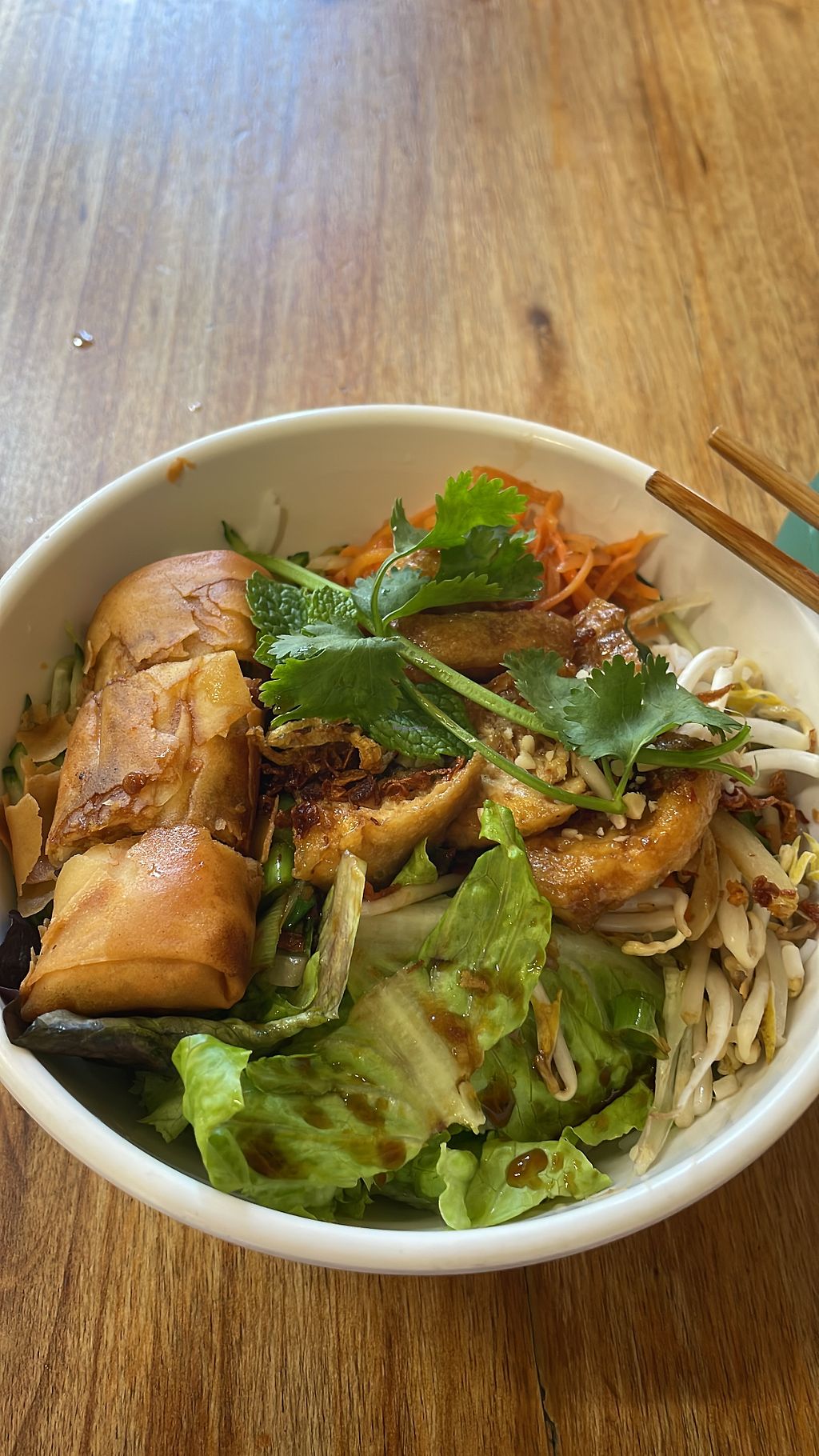 I had the rice noodle salad with tofu and veg springroll! It was amazing! Very delicious. I went one day later again. They even ask me if I want fish sauce or not. The stuff is also very friendly.