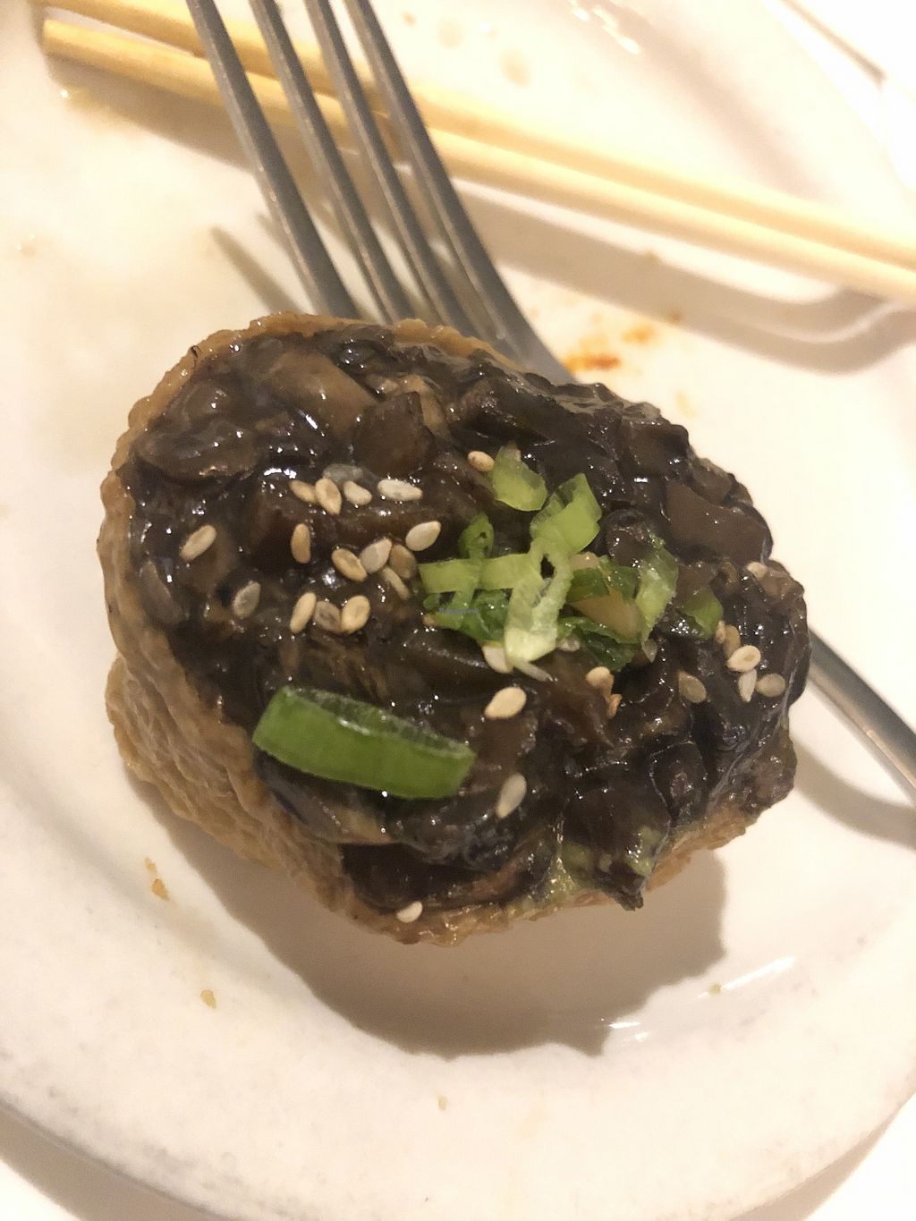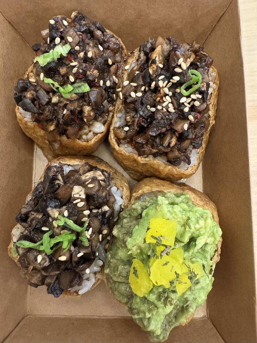 This place is a counter-serve place, mostly for takeout, but with a few seats. They have a limited menu, including three vegan items, of tofu skins filled with rice and a topping. They also offer drinks.