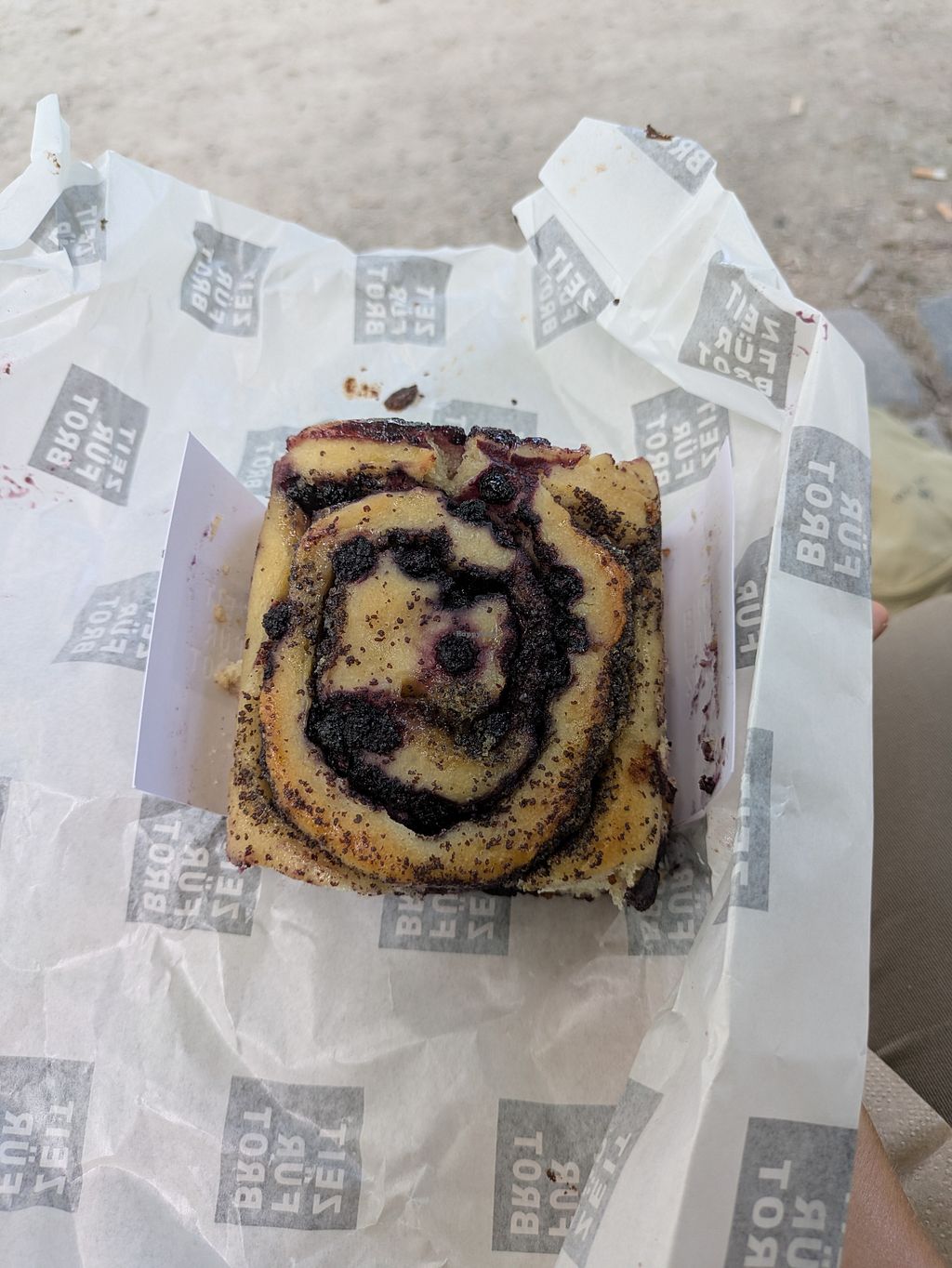 Die Backwaren von Zeit für Brot sind wahnsinnig lecker. Neben klassischen Broten gibt es als vegane Optionen Hummus/Grillemüse-Sandwiches, Zimtschnecken, Brownies und das absolute Highlight den „Schoko-Nuss-Baba“, ein Muffin der sehr fluffig und an genau den richtigen Stellen crunchy ist.