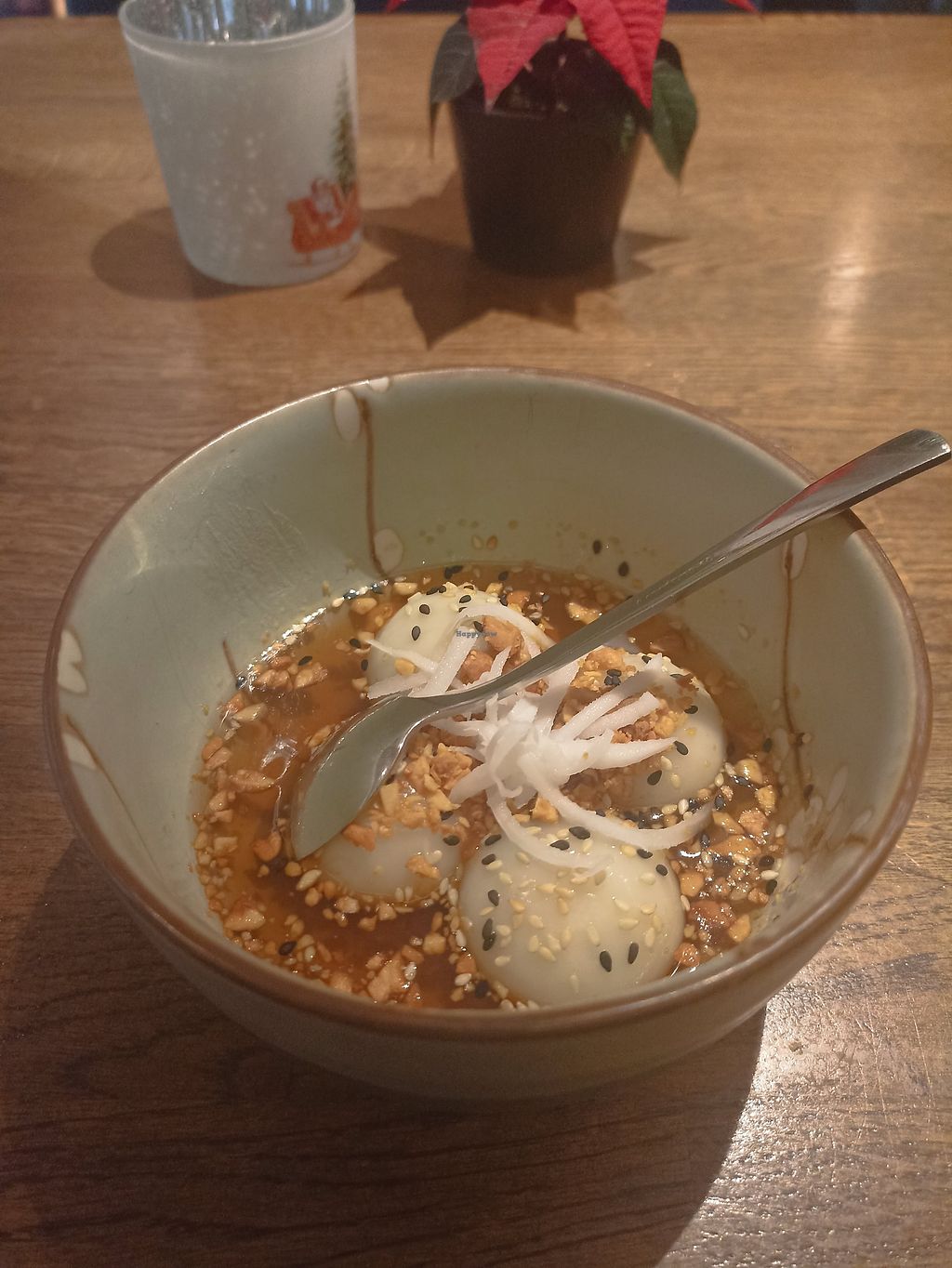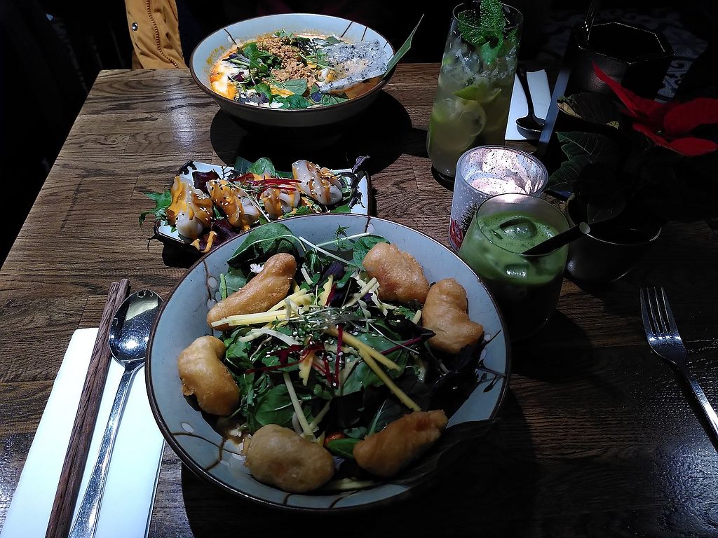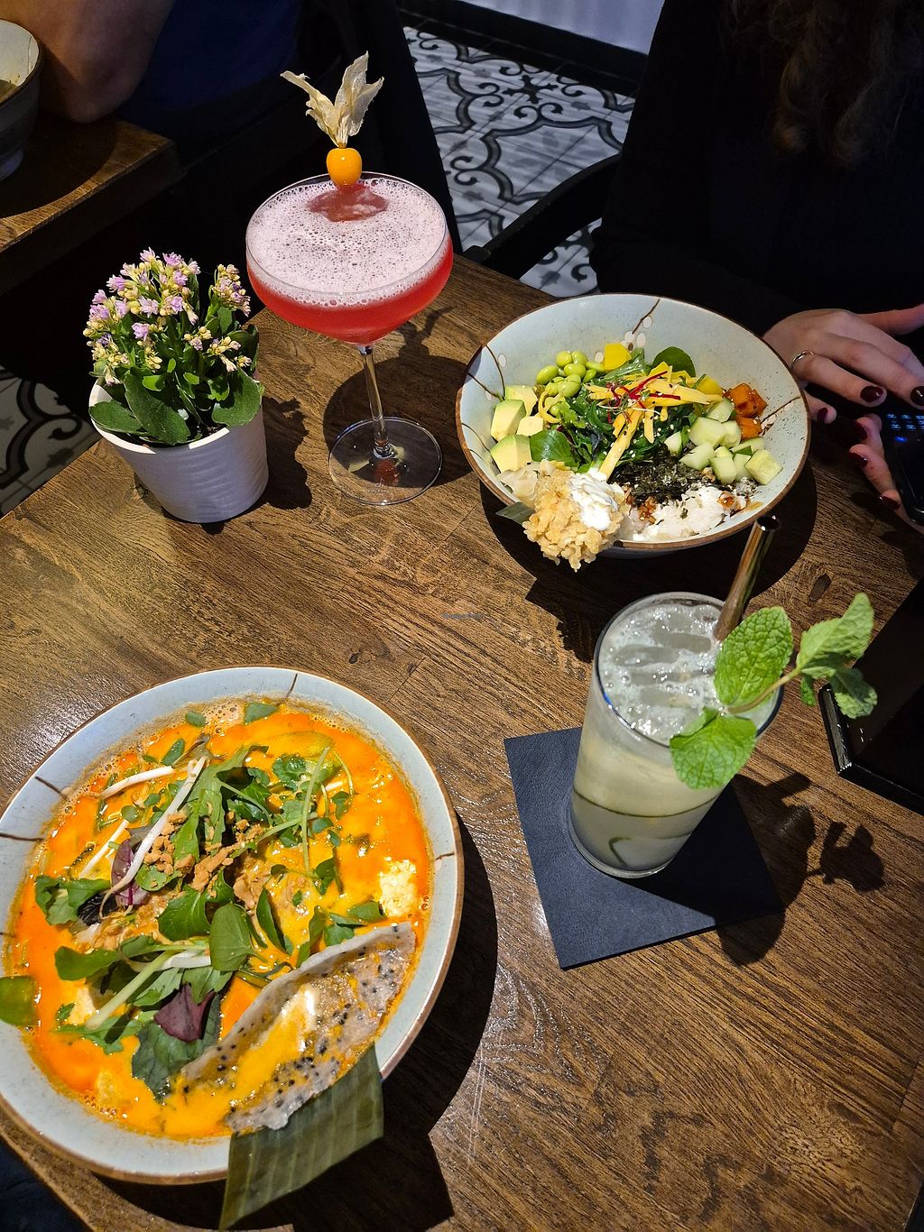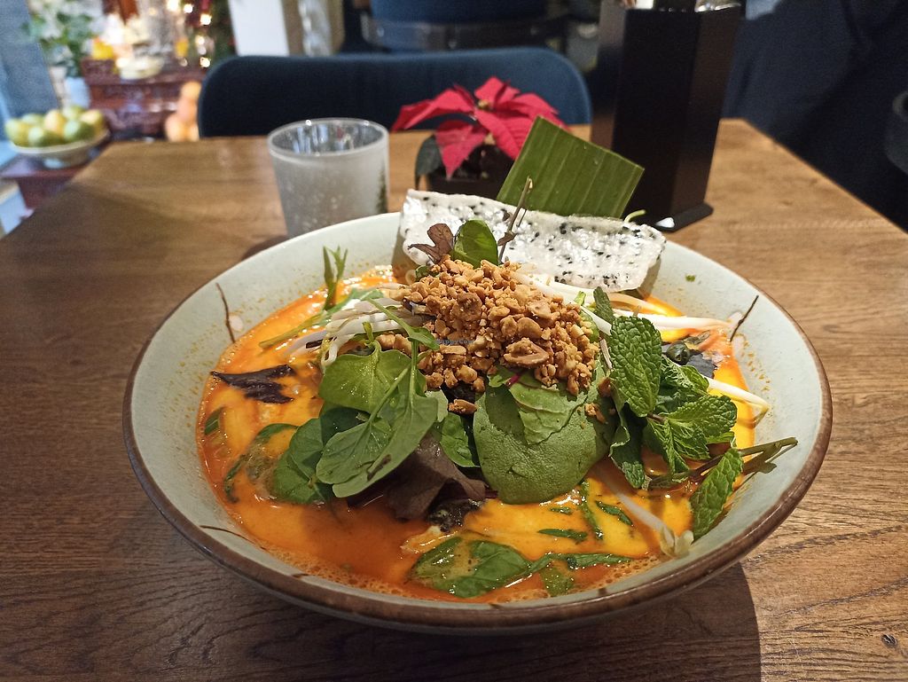 We had white pearls as a starter and golden soup and peanut cream as mains. The dumplings were nice with an intense sauce. The mains were tasty as well, but could have used more flavour for the curry and peanut. The tofu of the curry had little going for it but the shrimp in the cream were nice. Our drinks were good, mint lemonade and green dream. All in all, a good experience but not exceptional.