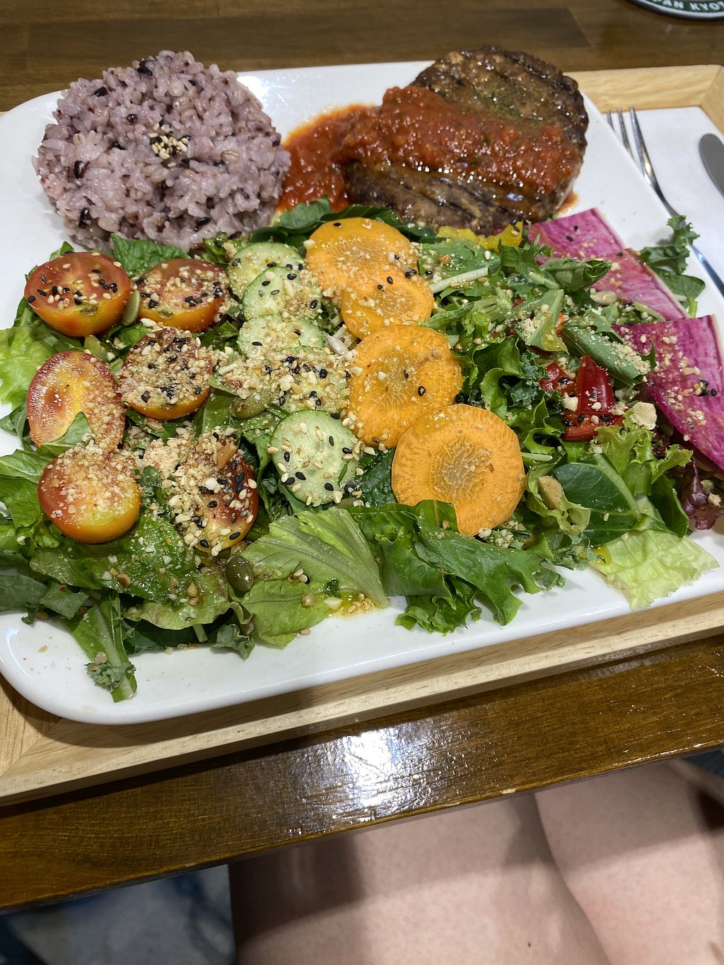 Really tasty vegan meal, we had the hamburg steak and soy cream in hamburg meals, which were super. The texture of the burgers was amazing and the side salad was really good too. The staff is really happy and friendly and interested in the customers. Really good atmosphere.