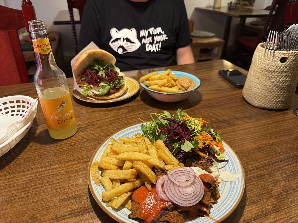 The vegan Döner kebab is amazing and it’s huge. Definitely worth the 9€. We had a big plate of fries as a side and it was way more than we could eat.